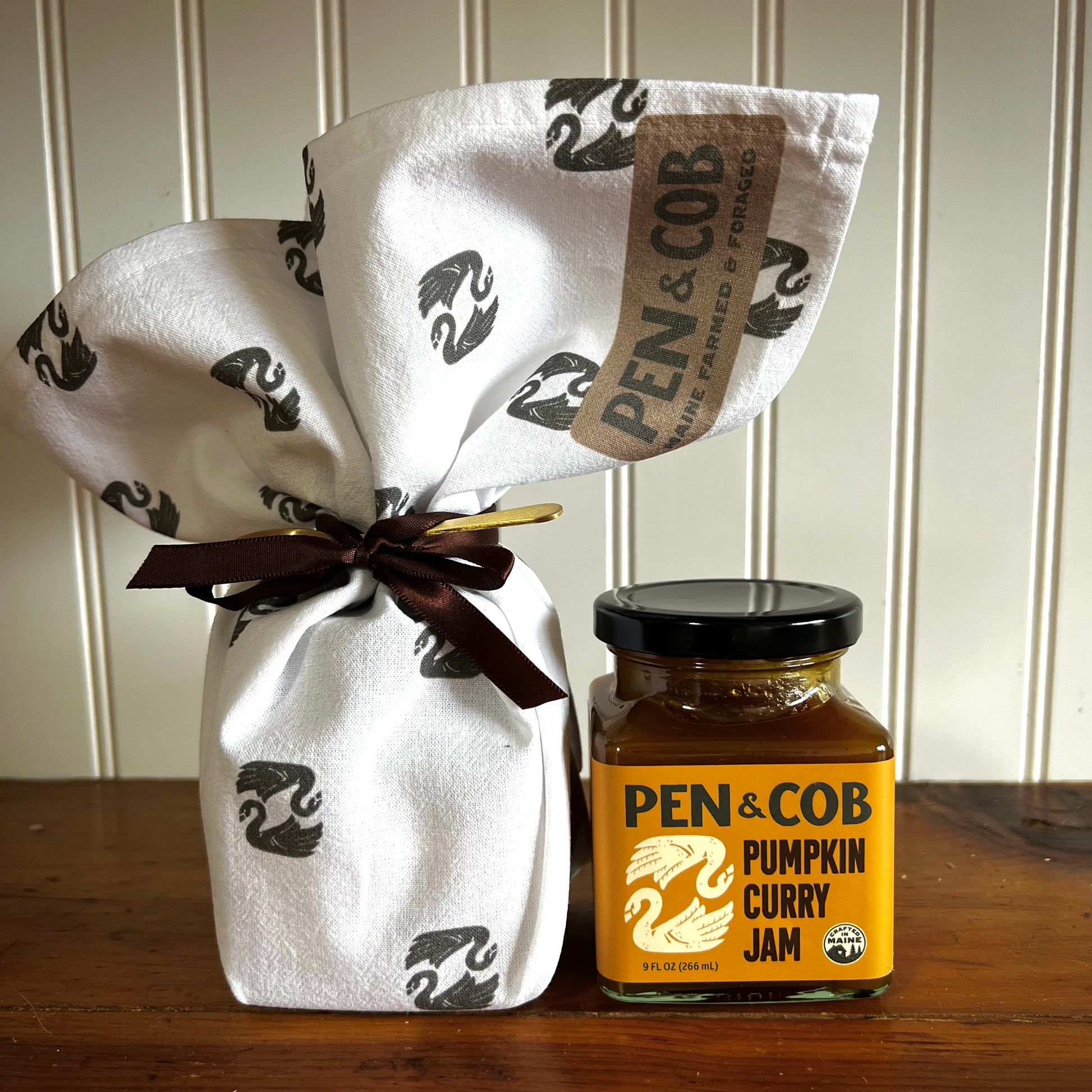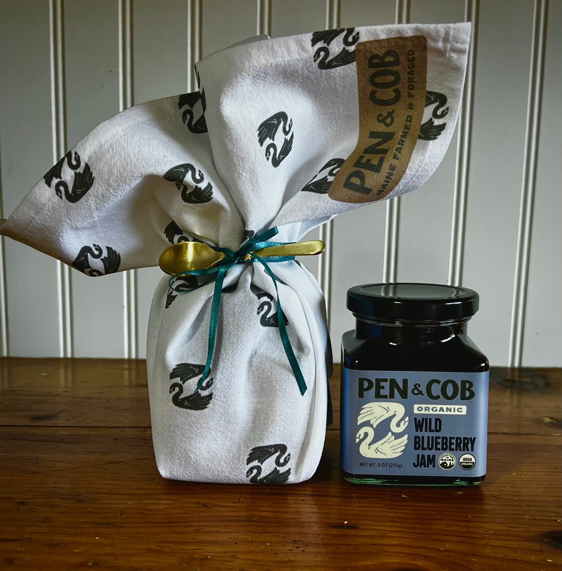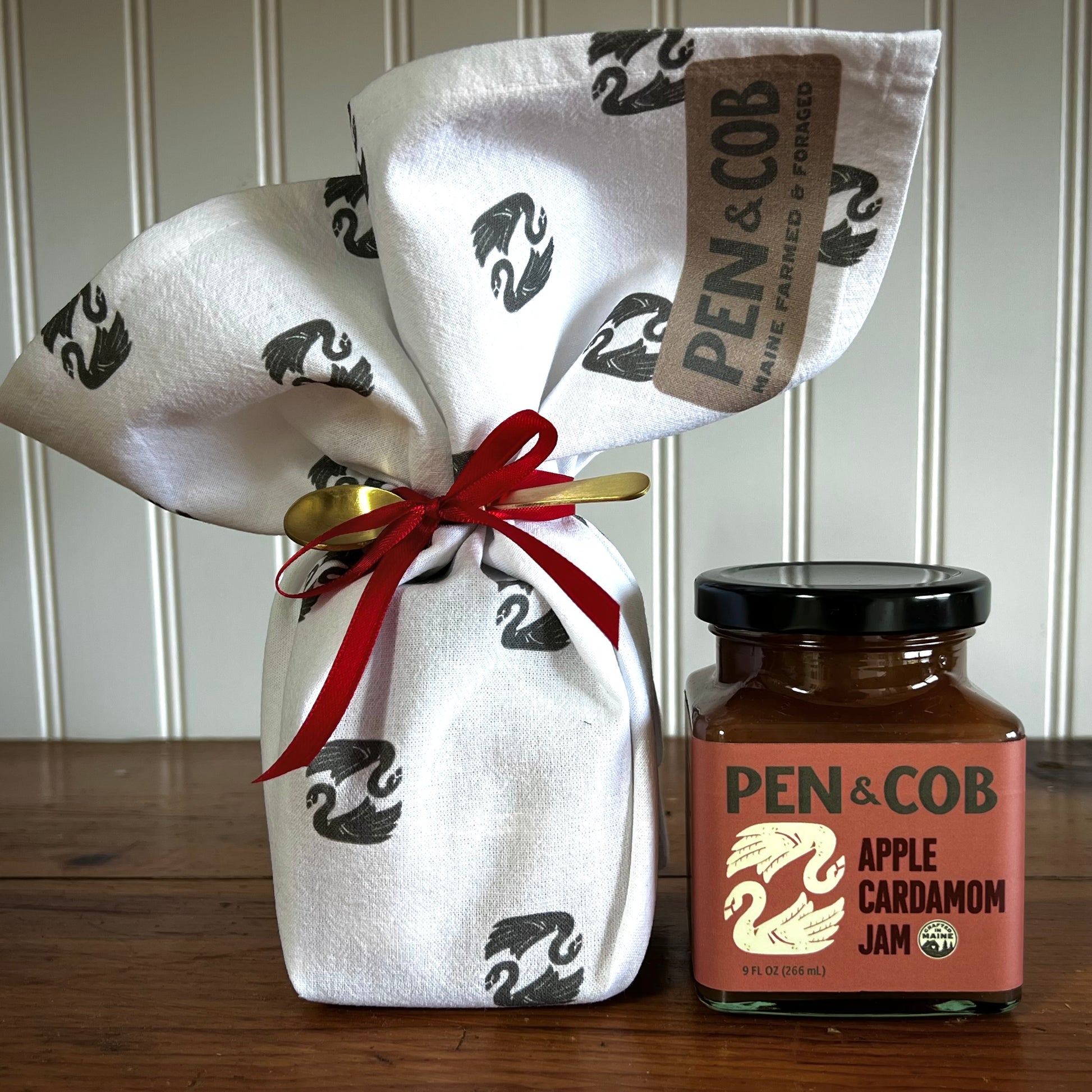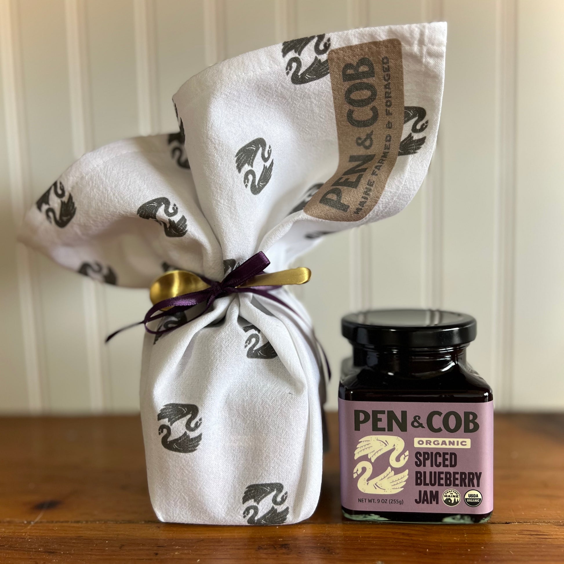 Give one 9oz jar of our small batch jam playfully wrapped in a 100% Turkish cotton kitchen towel. Tied with a ribbon with the absolutely-most-adorable brass jam spoon tucked in the bow.
